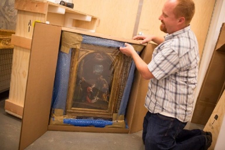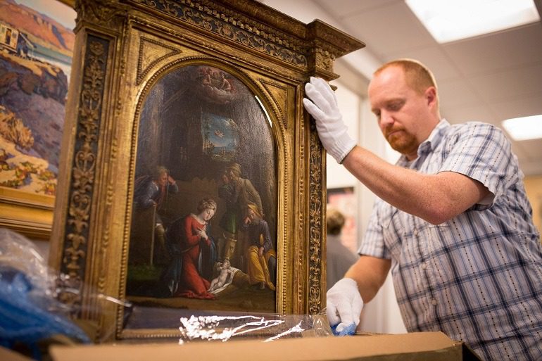 Chris Rupp, Westmont Museum collections manager, uncrating the Tisi painting. Image courtesy of Westmont Ridley-Tree Museum of Art