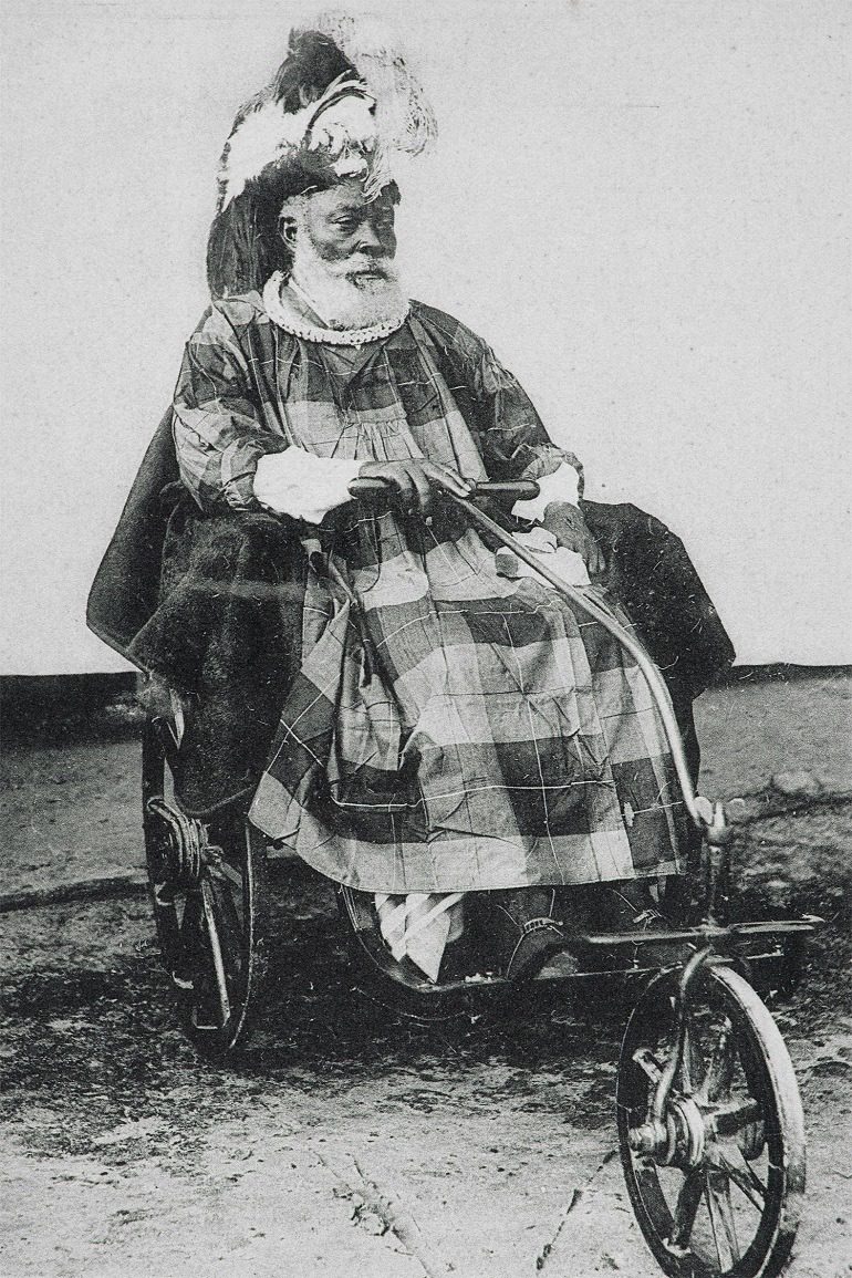 Dressed in a tunic with large squares, the man has on his head a cap decorated with feathers, wools, and cotton in the style of the colonialists. Bakana, who was one of the leaders of the Kalabari Ethnic group of the greater Ijaw tribe during the colonial era, sits on a tricycle. In addition to the opulence revealed through his ceremonial attire, the Bakana shows off his wealth with the tricycle, a Western invention. This was the power of photography during the colonial period.
