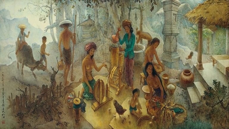 Lee Man Fong 1913-1988, Bali Life. Signed, stamped with a seal of the artist, inscribed and dated 1974, Oil on canvas 82.5 by 184 cm.; 32 1/2 by 72 3/8 in. 1974. Image courtesy of Sotheby’s