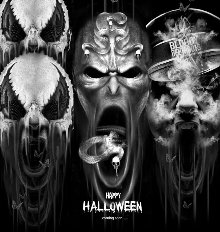 Obery Nicolas, Happy Halloween, Snakes, Masks, and Smoke. Digital art-Illustration- Image courtesy of the artist