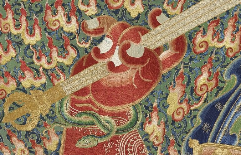 A section of the Imperial Embroidered Silk Thangka Yongle Six-Character Presentation Mark and of the period(1402–1424). Image courtesy of Christie’s Images Ltd