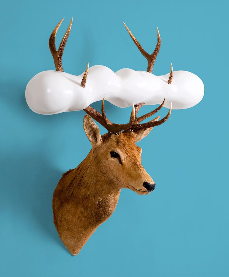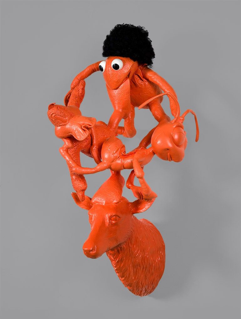Faesser’s appropriation of everyday objects and readymade are vivid in his sculptures. His sculptures and trophies made of inflatables and found objects are witty and provocative. In Roberto Blanco, a mixed media sculpture, Faesser pokes fun at Roberto Blanco, the only black German Schlager singer. Schlager is an entertainer music or German hit mix that emerged in Europe after the Second World War as a response to American rock and roll. As an entertainer, Blanco who wears an Afro wig has the tendency to open his eyes wide during performances and discussions. Those characteristics are the point of Faesser’s humorous reference, which draws a similarity between the musician and Kermit the Frog. Faesser’s sculpture has the head of a deer. On the deer’s head are mini-sculpture of an ant, Kermit the Frog and other found objects.