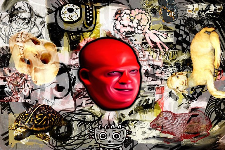 Many of Faesser’s collaged backgrounds seem to express the internal emotions of the dominate image. In Cherry Head, for instance, the head of a man with a mischievous smile on his face is superimposed over images of turtle, rodents, skull, and some anthropomorphic images. These images are very symbolic as they reference the character of the man, who is evidently a flamboyant, corny and dangerous man.