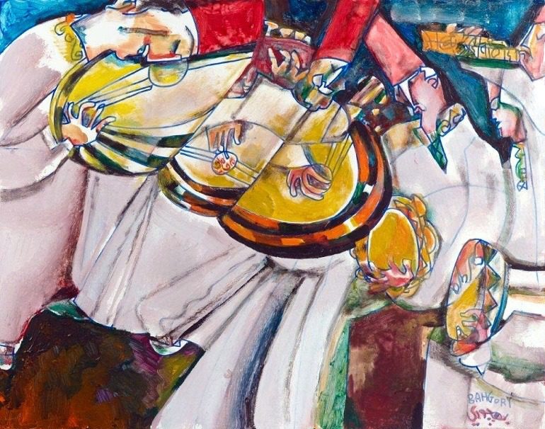 Sufi Musicians, an oil on canvas painting by Egyptian artist George Bahgory Celebrates Lifestyle and Culture in Egypt. Image courtesy of Al Masar Gallery for Contemporary Art.