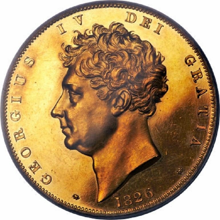 Great Britain: George IV gold Proof 5 Pounds 1826 PR62 Cameo PCGS . Sold for $76,375.Rare coins Image courtesy of Heritage Auctions
