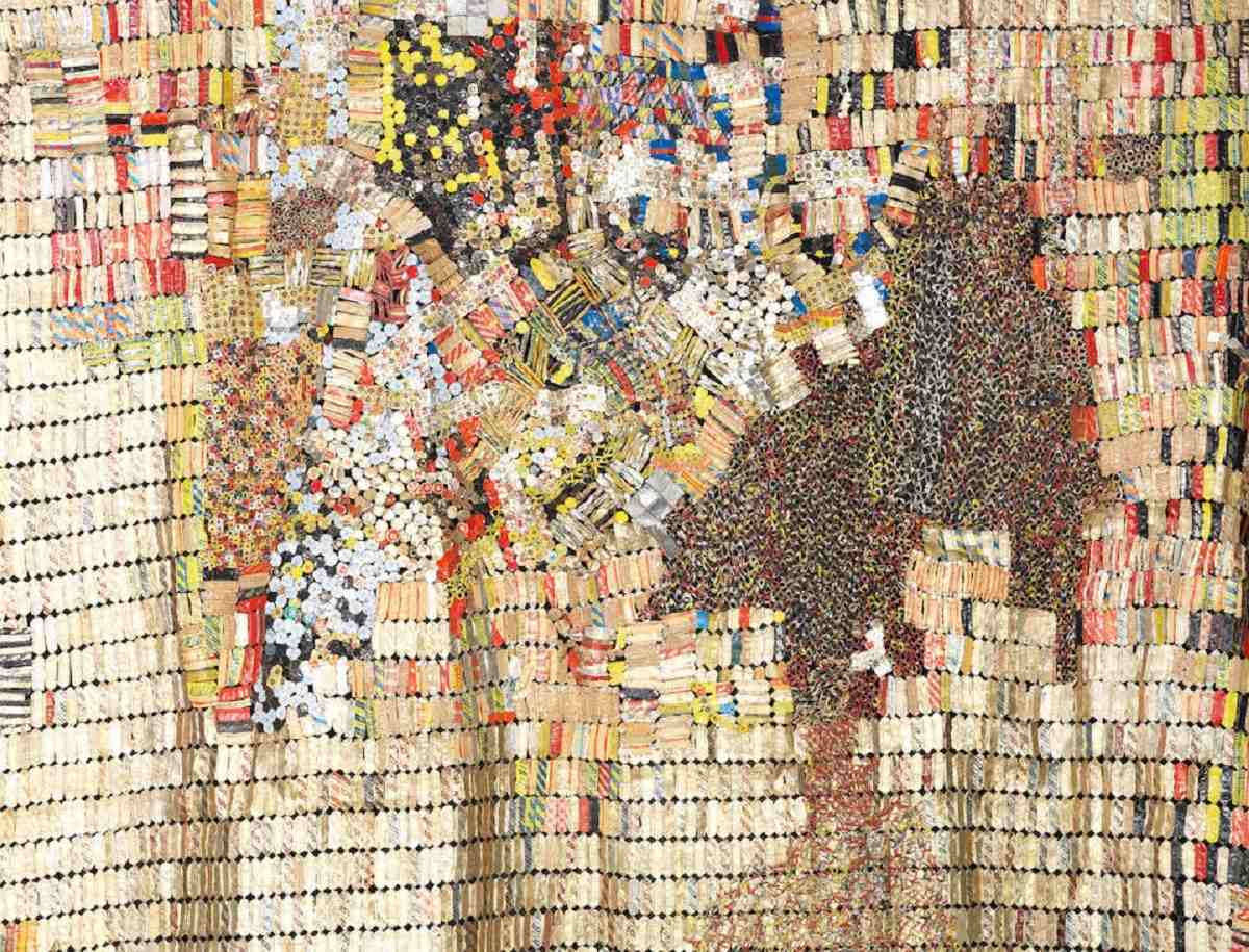 El Anatsui (Ghanaian, born 1944), New World Map, aluminum bottle caps, and copper wire 340 x 500cm (133 7/8 x 196 7/8in) Detail. Sold for £541,250 (US$ 801,221) inc. premium. Image: Bonhams Auctions Africa Now