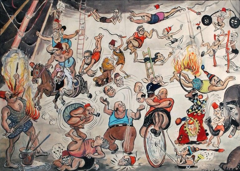 A Political Circus by Alexander Saroukhan is one of the cartoons that shaped Egypt’s political environment. Water colors on paper 45 x 65 cm. Image: Al Masar Gallery