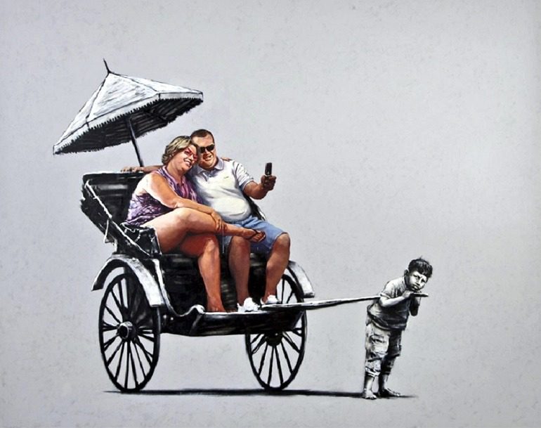 Banksy continues with his critique of capitalism, ostentation, and oppression with Rickshaw. The piece depicts a couple sitting in a rickshaw whispering sweet nothing in each other’s ears. Pulling the rickshaw is a small boy using all his might to ensure the couple is comfortable. While the couple smile as they take selfies on their cell phones, the boy pulls the rickshaw with pain writing all over his face. On one level, this piece points to child labor, while on another, it symbolizes the exploitation of third and poor nations by Western nations. The couple who are evidently Westerns are nonchalant about the pain of the poor boy getting crushed by their weight.