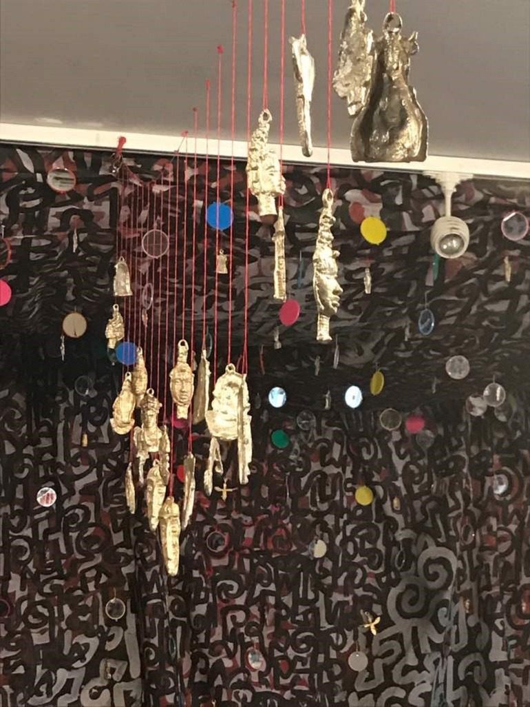 Ehikhamenor‘s A Biography of the Forgotten follows the tradition of natural synthesis. The installation consists of several large canvases bearing the motifs, drawings, and paintings of images found on wall murals and shrines in Benin. Interwoven with the large canvases are mirrors and hundreds of Benin bronze statuettes hanging overhead. Although Ehikhamenor‘s work addresses a fragmented history, it also reflects interconnected narratives of the colonizers and colonized.