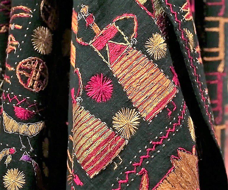 On display are large shawls measuring about 8 ft x 5 ft. The beautiful vibrant silk embroidery on a plain-woven cotton cloth shows the creativity that went into creating the designs. The design is meticulous and the colors are captivating.