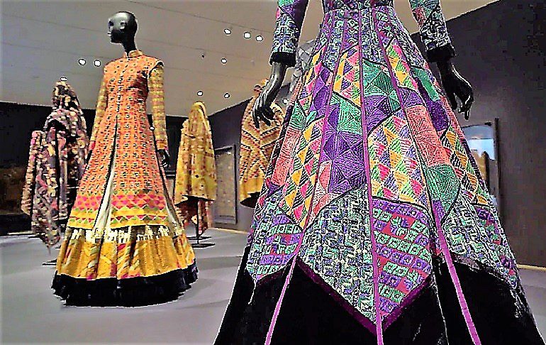 In the last fifty years, phulkari techniques and patterns have experienced a revival, especially as commercial art. With tourism booming in Pakistan and India, the phulkari tradition has evolved beyond Pakistan. Adding to the popularity of phulkari textiles is the entertainment industry, including films, music, and videos. Today, the Phulkari tradition features prominently in popular music performances and videos. Furthermore, fashion designers are also taking a lot of interest in Phulkari and are using it for high-end designs. One of them is Manish Malhotra. The famous fashion designer recently created a phulkari-based couture collection that took the world by surprise. His designs are part of this important exhibition.