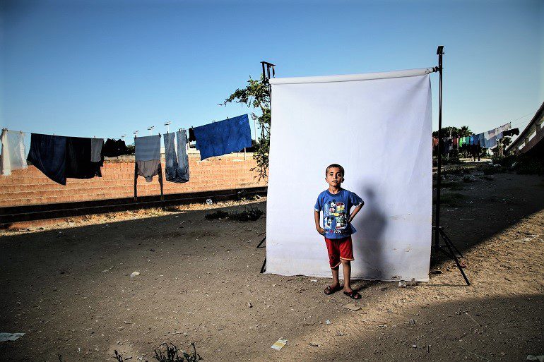 In one of the photographs, a boy stands in front of the white canvas. The backdrop is on a roof with clothes hanging on lines and destruction in the distance. Despite the derelict environment, there is so much dignity and pride in this little boy. Hands akimbo and a bright smile on his face, the boy shows off what is perhaps his best outfit. His blue shirt has images of Mickey Mouse and some alphabets. His torn red short matches his tee-shirt perfectly. On his feet are flip-flops with red and blue straps. The boy projects pride in a way that says, “You can’t kill my soul”.