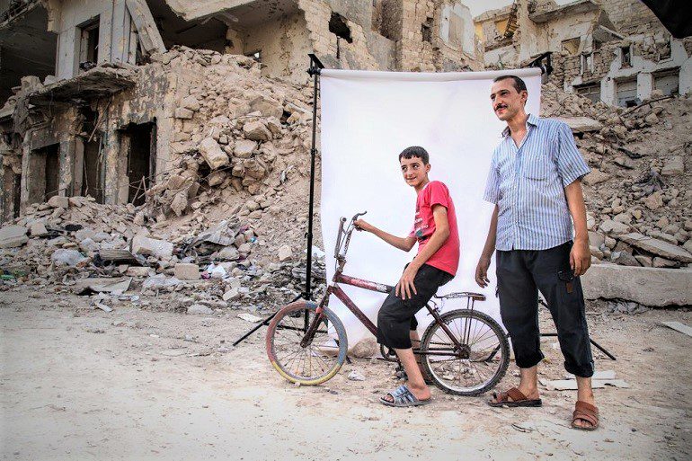 The picture of a boy on a bicycle with his father standing beside him is another important image from the Syrian civil war children project. Standing in front of the white canvas backdrop placed in the ruins in the ruins of the Syrian civil war, they smiled as they gazed into the camera. Moments like this are very rare in the Syrian civil war zone. Because of the war, parents do everything to spend every moment with their children. This is one of such moments.