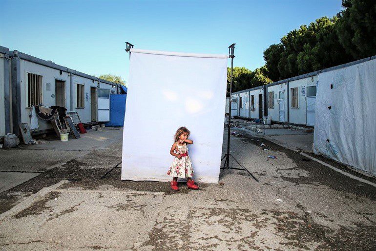 The photograph of a little girl taken in what looks like a refugee camp is beautiful and haunting at the same time. Wearing a sleeveless dress with flower motifs, the girl who is just about 4years old stands in front of the white backdrop. On her feet are oversized red shoes that seem to have come from her elder sister or mother. Perhaps they came from the feet of a war victim. That is the story of the Syrian civil war children. There is so much innocence in this picture. In what seems an attempt to get herself ready for the photograph, the girl uses her arm to clean her mouth. It was at that moment that the camera went click. Not even the atmosphere of poverty could take away from the charm of the girl in the picture.