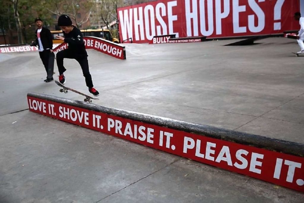 A skater at Barbara Kruger Performa 17 Commission at the installation at Coleman Skatepark in New York City. Image: Perform