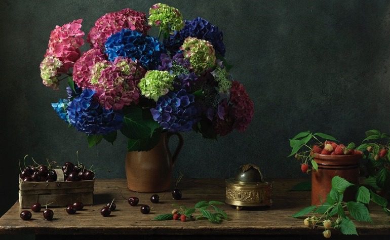 Near the center of the table is a colorful bouquet of flowers in a wine jug. The red, blue, green, and purple flowers balance the arrangement and color composition. Further enhancing the composition is what looks like an ink or snuff bowl placed around the raspberries. This is a well-thought-out composition. Although the ambiance of the photograph is mimetic of the 17th-century tenebrism, a newness about it puts it in the modern era.
