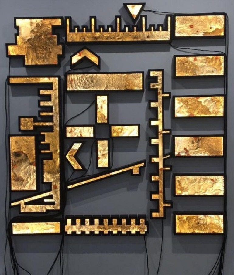 New works by Andrew Luk are some the major presentations by De Sarthe at Art Basel Hong Kong. Luk’s works are unique. He explores epoxy resin, polystyrene, plastic, paint, canvas to raise questions about war. In his Horizon Scan series, he uses torched and charred painted canvas to create a unique art piece. The burned remains are carefully collaged together, submerged in resin and painstakingly polished for several days to produce the nal work in the shape of an unmanned military drone’s crosshairs. The works is lit from within, illuminating an unfamiliar landscape that exists outside of the wall it rests upon.