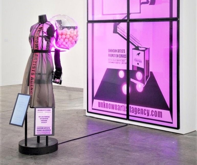 Wang Xin is one of the artists from the De Sarthe stable whose works are generating serious conversation at this year’s Art Basel Hong Kong. Her works are interrogative and interactive. Uses language and signs, she challenges the status of the artist and the functioning of the art market today. Her artworks take the form of installations, moving images and new media. Wang Xin, Unknown Artists Promotion Service – Walking Promotions by Unknown Artists Agency, one of the installations by Wang Xin on display at the Art Basel Hong Kong loudly challenges the status-quo of the art world and how artists are promoted, discovered, and appreciated.