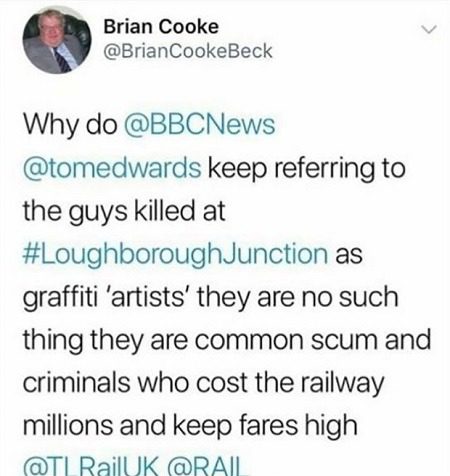 However, even as people are remembering the three dead graffiti artists, there are those who see them as vandals causing the government so much money. One of such is Brian Cooke, a former Transport for London chairman. Soon after the death of the three men was announced, Cooke took to Twitter and asked: “Why do BBC News keep referring to the guys killed at Loughborough Junction as graffiti ‘artists’ they are no such thing they are common scum and criminals who cost the railway millions and keep fares high.”