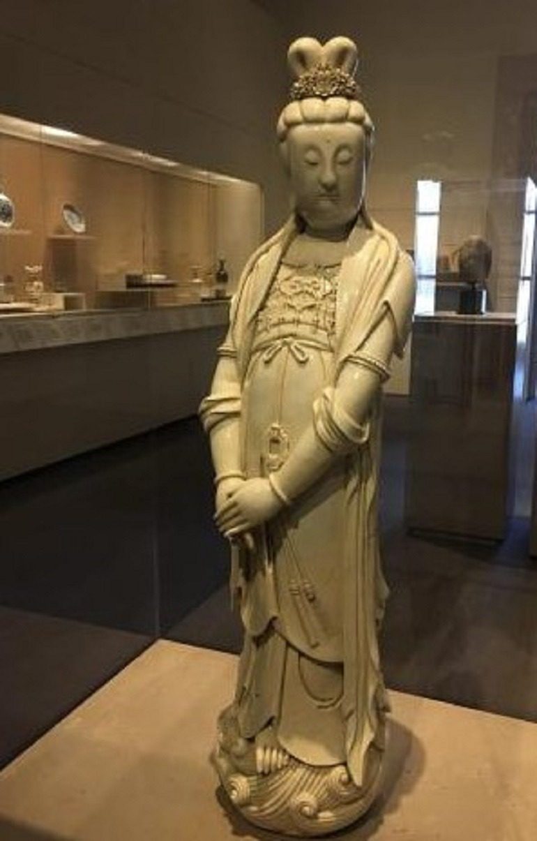 There is a duality and complexity about Guanyin that complicates the general notion of sexuality. Guanyin is a Buddhist Bodhisattva, an enlightened being that has delayed reaching nirvana to help others. Frequently portrayed as male, female, neither or both, Guanyin’s constantly navigates the threshold sexuality, cascading through boundaries at will. In this porcelain statue made in the late 19th or early 20th century, “she” takes on a feminine form. The androgynous appearance of Guanyin in East Asian visual culture may represent the Bodhisattva’s transcendence of earthy confines.