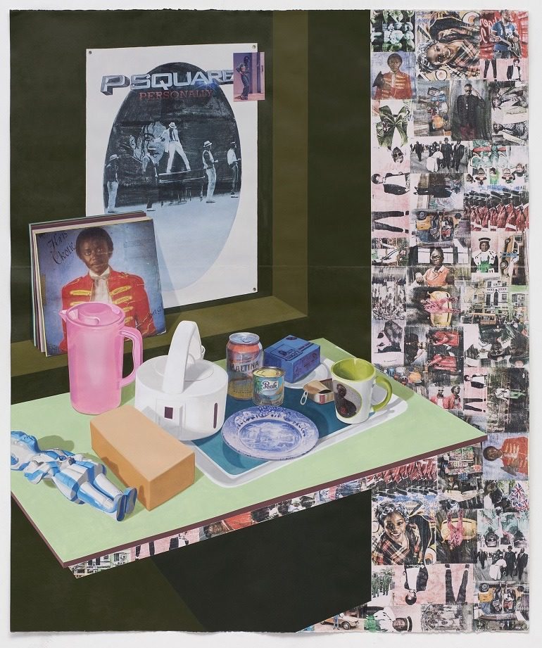 Njideka Akunyili Crosby’s As We See You: Dreams of Jand, 2017 is another of the new works on display. The work fuses collage, photo transfers, drawing, and painting to depict an imaginary interior of a Nigerian home. The work examines the impact of Michael Jackson as a source of aspiration for Nigerians who saw themselves in him. Crosby’s work is a shrine to a god. A section of the work includes signed album covers, toys and other iconic objects related to Michael Jackson. Akunyili Crosby is very succinct in explaining the idea behind her work: