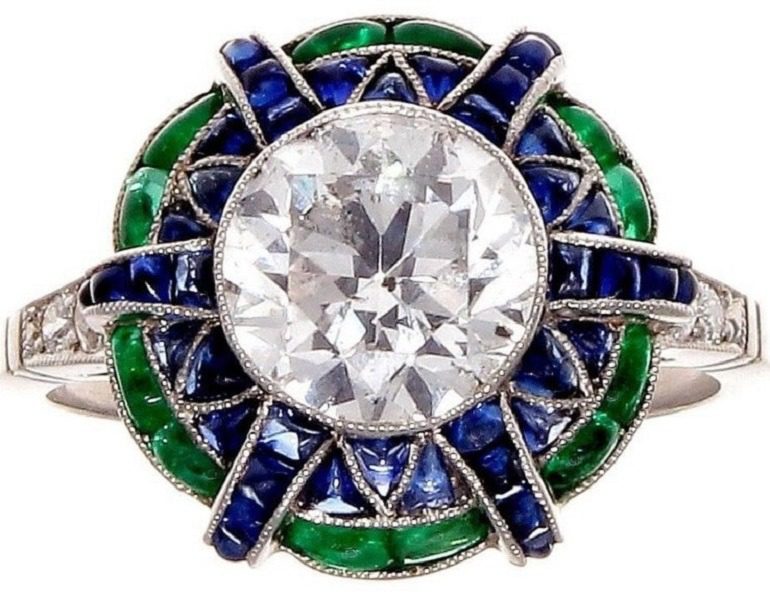 A beautiful 2.05 Carat old European cut diamond emerald Sapphire platinum ring, is one of the pieces of jewelry to be offered by Jack Weir & Sons at Baltimore Largest Art Show.
