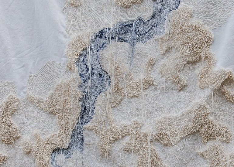 Sharmistha Kar’s presentation is titled Next to a River – Embroidery as Map and Shelter. The show is a meditation on ideas of belonging, migration, and identity. Kar’s MFA candidate exhibition features textile works adorned with hand embroidery. His artistic practice forges connections between traditional craft and regional and personal histories.