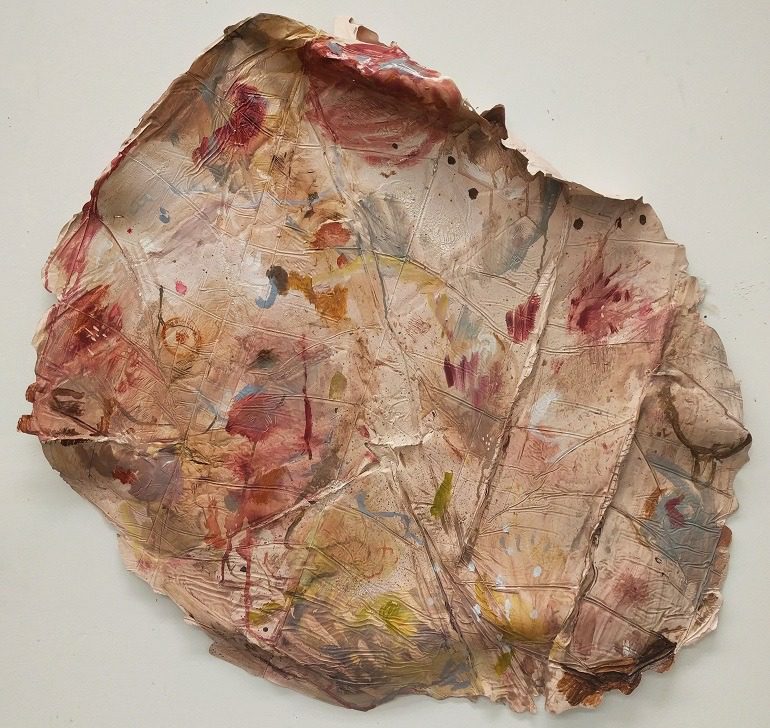 Many of the works in skim consist of plastics, latex, and refuse. On one level, the works explore materiality and corporeal ambiguity, revealing literature on the abject and grotesque. On another level, the works reveal the subliminal aspect of the dematerialization of the discarded materials. From the pleating, folding, and delicate netting of the decomposing materials, a tender meditation on beauty emerges.