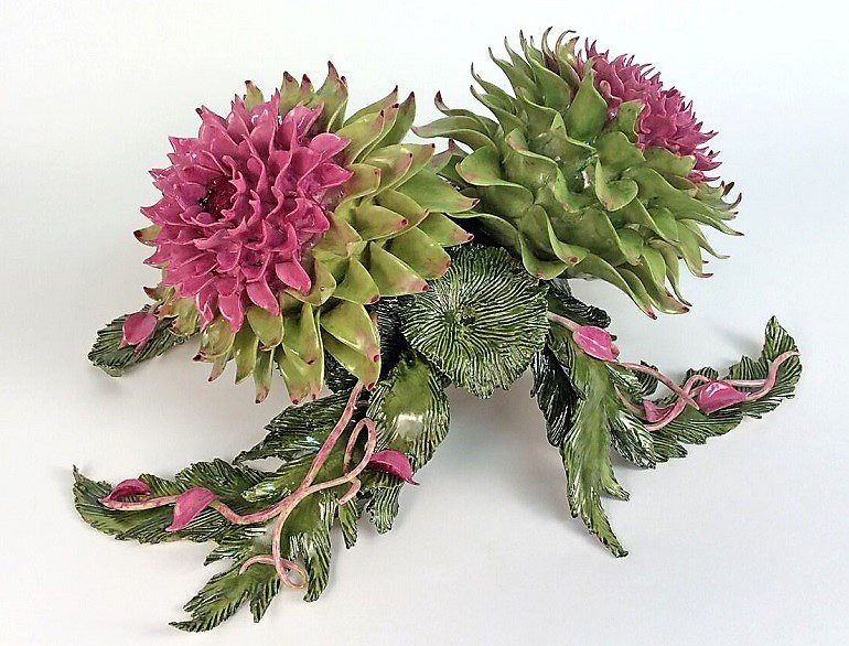 Katherine Houston, Porcelain Himalayan Thistle. Hand-sculpted porcelain with multiple layers of over-glaze 7.5″ H x 17″ L x 13″ W. Image: Artist
