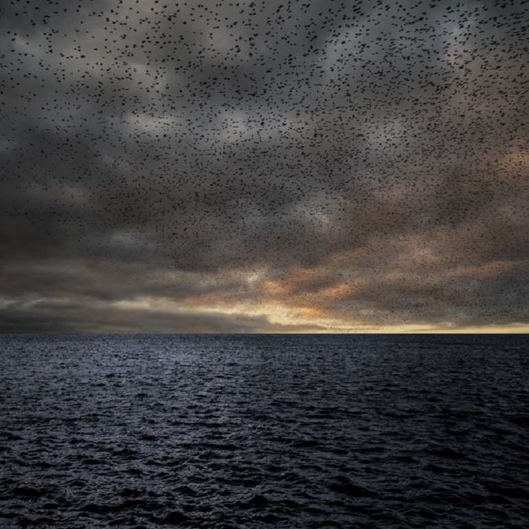 A surreal landscape photograph with dark clouds and eerie birds in the sky by Dutch landscape photography artist Saskia Boelsums.