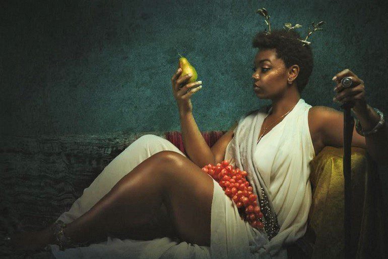 Saint Sugar Hill, 2017, is a portrait of a woman wearing a flowing white robe sitting on a sofa. In her right hand is a pear, while a staff leans on the left-hand rest. The woman intensely gazes at the pear as if contemplating its lusciousness. On the woman’s stomach is a bunch of red grapes near a string of beads. The woman’s hair is decorated with some leaf ornaments, complimenting her nobleness. This is a woman of status, and the picture shows it.