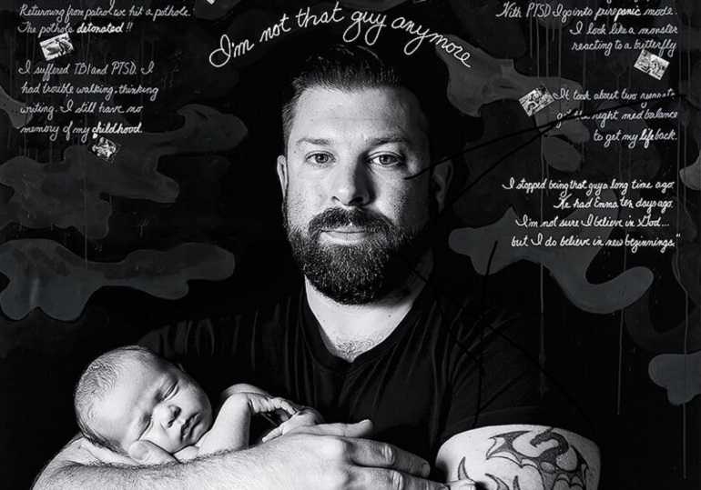 Josh, an American veteran who suffers from PTSD shows off his baby Emma in this black and white portrait by artist Susan J. Barron. Image: Susan J. Barron