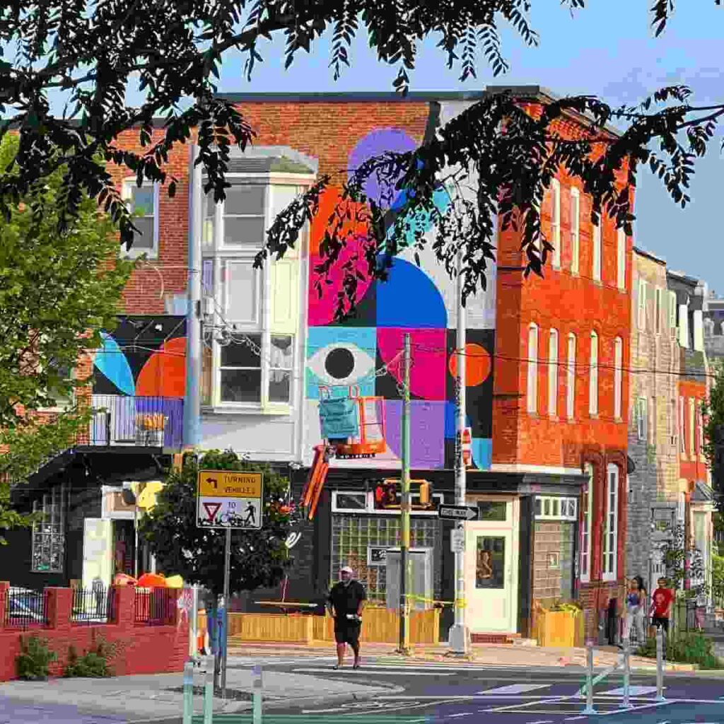 BALTIMORE, MARYLAND– The corner of Maryland and East Lafayette Avenues has undergone a captivating transformation that has caught the attention of passersby. A striking mural now graces the side of the building at 1733 Maryland Ave., an artistic endeavor that has brought a new vibrancy to the area. This masterpiece, Bauhaus Blue, was meticulously crafted by the talented local muralist Jaz Erenberg. Erenberg revitalizes the façade with vibrant colors, shapes, and symbolism, delivering a message of artistic inclusivity.