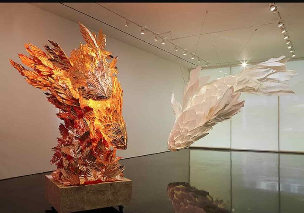 One of the most striking aspects of Ruminations is the meticulous installation of the works, designed to achieve maximum impact. Several sculptures are strategically placed near the gallery’s windows, allowing passersby on Madison Avenue to catch a glimpse of the stunning artworks inside. The internal illumination of some sculptures, crafted from copper and Formica, further enhances their boldness and allure. For example, in the gallery’s first room, a single copper fish hangs suspended from the ceiling, catching the eye of those passing by. Two freestanding clusters, displayed on sturdy, handmade wooden bases, contribute to the installation’s boldness, complementing another large hanging fish nearby.
