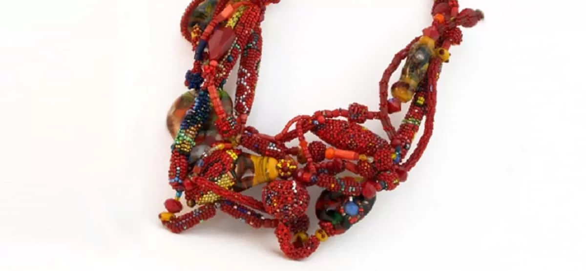 A beautiful necklace made of beads, Red Electricity by Joyce J. Scott, is one of the Baltimore art gifts you should buy to celebrate Baltimore artists. Image: Craft in America