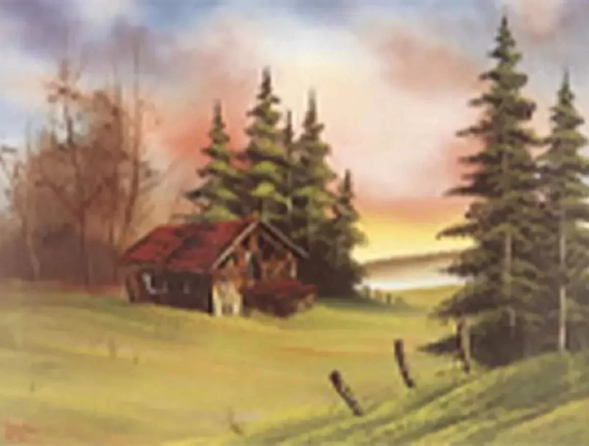 Cabin at Sunset is one of the major works in the John Oliver’s Bob Ross Auction for Public Broadcasting. Image: PBS