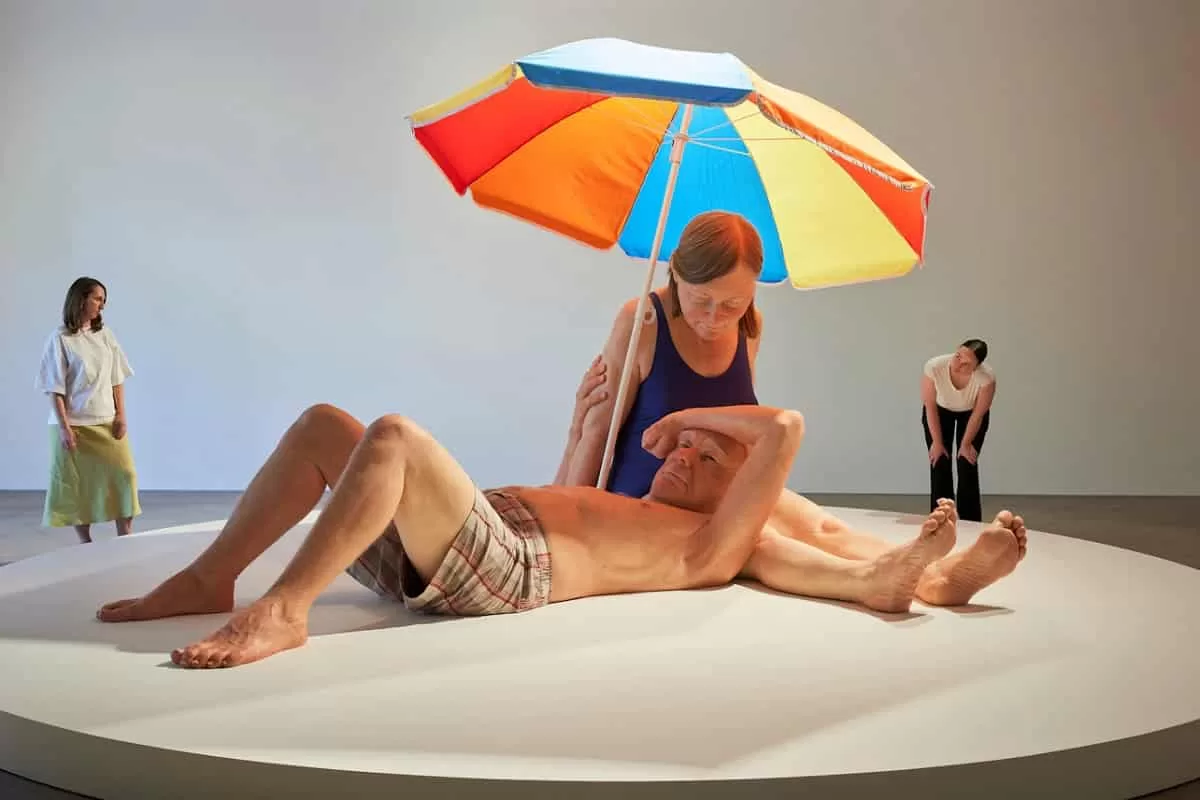 The Ron Mueck Encounter exhibition at the Art Gallery of NSW features hyperrealist sculptures like Couple Under an Umbrella, a sculpture depicting intimacy and tension.