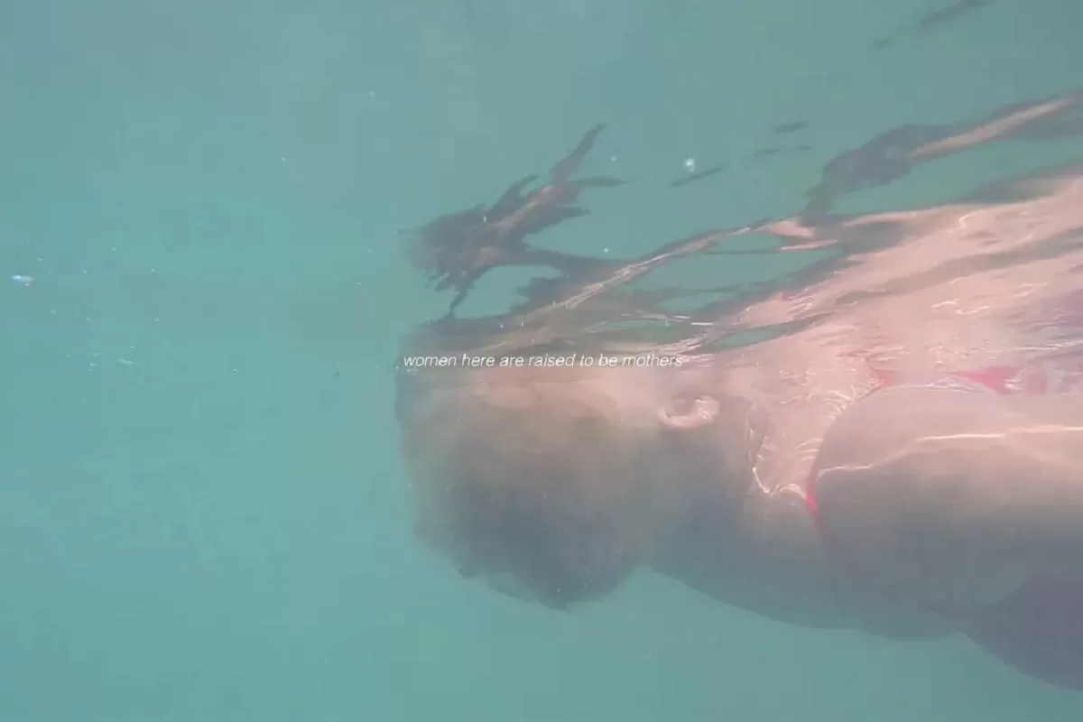 In Retiro (2019), Natalia Lassalle-Morillo uses the fluid movement of a swimming woman to challenge the rigid structures of hydro-politics and borders. The text overlay reminds us how identity and gender are shaped by the environments we inhabit. Image courtesy of the artist.