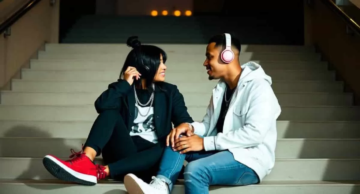 Lovers, a man and a woman, having fun enjoying some of the top rap love songs. They are wearing headphones, and smiling at each other